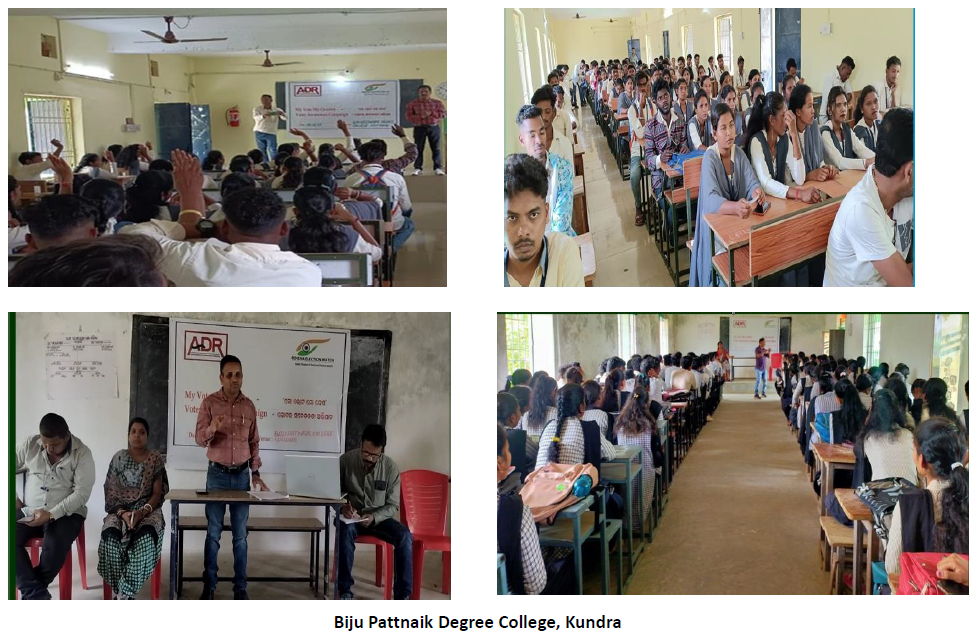 "Mera Vote Mera Desh" voter awareness campaign for youths was organized by Odisha Election Watch in collaboration with ADR at Biju Pattnaik Degree College, Kundra, in Koraput district on 06th March 2024. The event saw 154 participants.