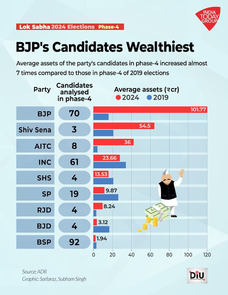 The average asset of a Phase-4 BJP candidate is Rs 101.77 crore, while that for the Congress party is Rs 23.66 crore. The Bahujan Samaj Party, which fielded the maximum number of candidates (92), has the lowest average declared assets of Rs 1.94 crore.