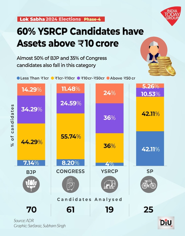 In Phase-4, the BJP fielded 70 candidates. Of them, 10 have assets above Rs 50 crore. About 44.3 per cent of the party’s candidates declared assets between Rs 1 crore and Rs 10 crore. Only five candidates have assets worth less than Rs 1 crore.