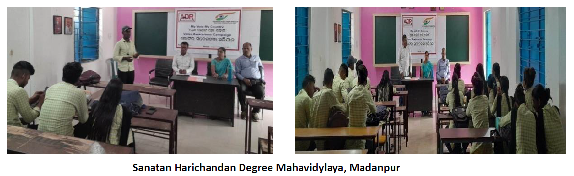 "Mera Vote Mera Desh" voter awareness campaign for youths was organized by Odisha Election Watch in collaboration with ADR at Sanatan Harichandan Degree Mahavidylaya, Madanpur, in Kordha district on 31st March 2024.