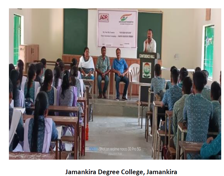 "Mera Vote Mera Desh" voter awareness campaign for youths was organized by Odisha Election Watch in collaboration with ADR at Jamankira Degree College, Jamankira, in Sambalpur district on 12th March 2024. The event saw 118 participants.
