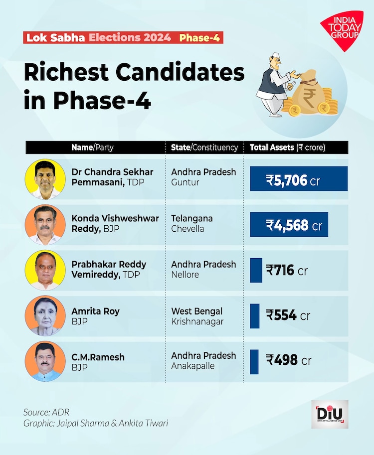 The average asset per candidate contesting in the fourth phase is Rs 11.72 crore. Dr Chandra Sekhar Pemmasani of the Telugu Desam Party who is contesting from Guntur in Andhra Pradesh is the richest, with more than Rs 5,705 crore in declared assets, followed by Konda Vishweshwar Reddy of the Bharatiya Janata Party with Rs 4,568 crore. Reddy is contesting from Chevella in Telangana.