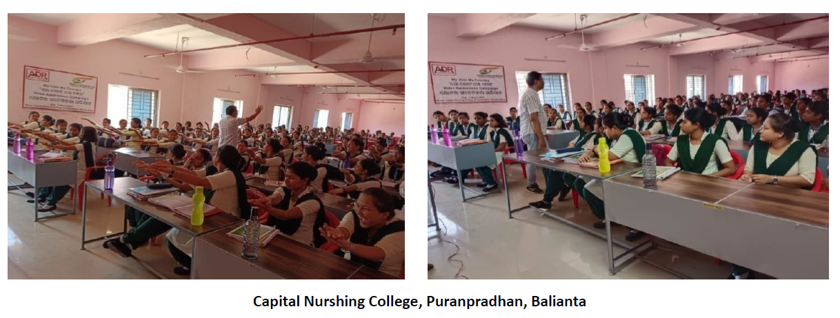 "Mera Vote Mera Desh" voter awareness campaign for youths was organized by Odisha Election Watch in collaboration with ADR at Capital Nurshing College, Puranpradhan, Balianta, in Kordha district on 02nd March 2024.