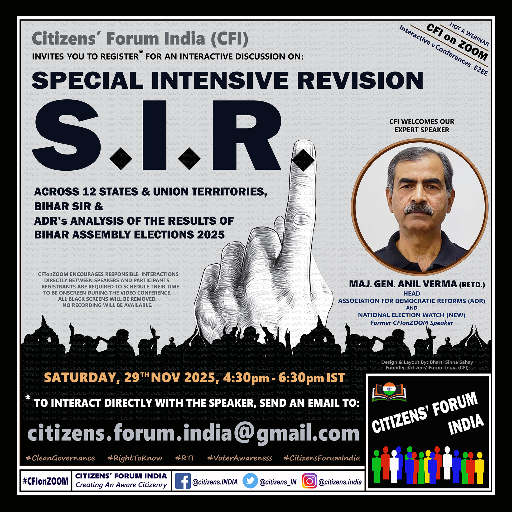 Citizens' Forum India (CFI) organised an interactive session on "SIR across 12 States & UTs, Bihar SIR & ADR's Analysis of the results of Bihar Assembly Elections 2025" on 29th November 2025. Maj Gen Anil Verma (Retd) (Head of ADR) was the speaker at the event.