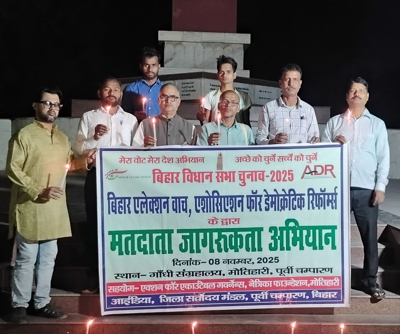 At the Gandhi Museum, Motihari, East Champaran, the Bihar Election Watch, in collaboration with Action for Accountable Governance, Netrika Foundation (Motihari), IDEA, District Sarvodaya Mandal (East Champaran, Bihar), organised a voter awareness campaign for women on 08th November 2025. During the event, participants took a pledge to vote by signing a campaign board and lighting candles to appeal for voting on the polling date.