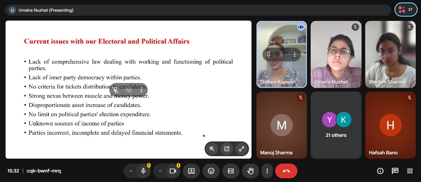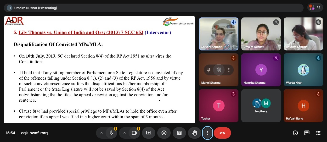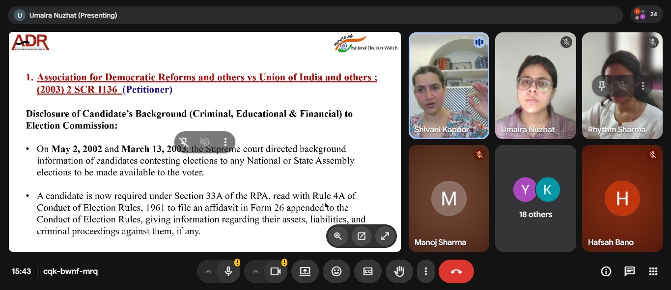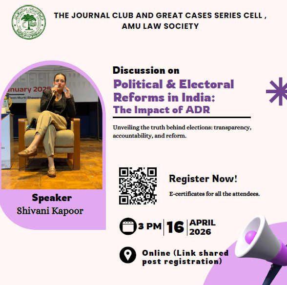 The Journal Club and Great Cases Series Cell, Aligarh Muslim University Law Society, organised an online discussion on "Political and Electoral Reforms in India: The Impact of ADR" on 16th April 2026. Ms Shivani Kapoor, Program Lead and Manager (Legal) at ADR, was the speaker at the event. 26 students attended the discussion.